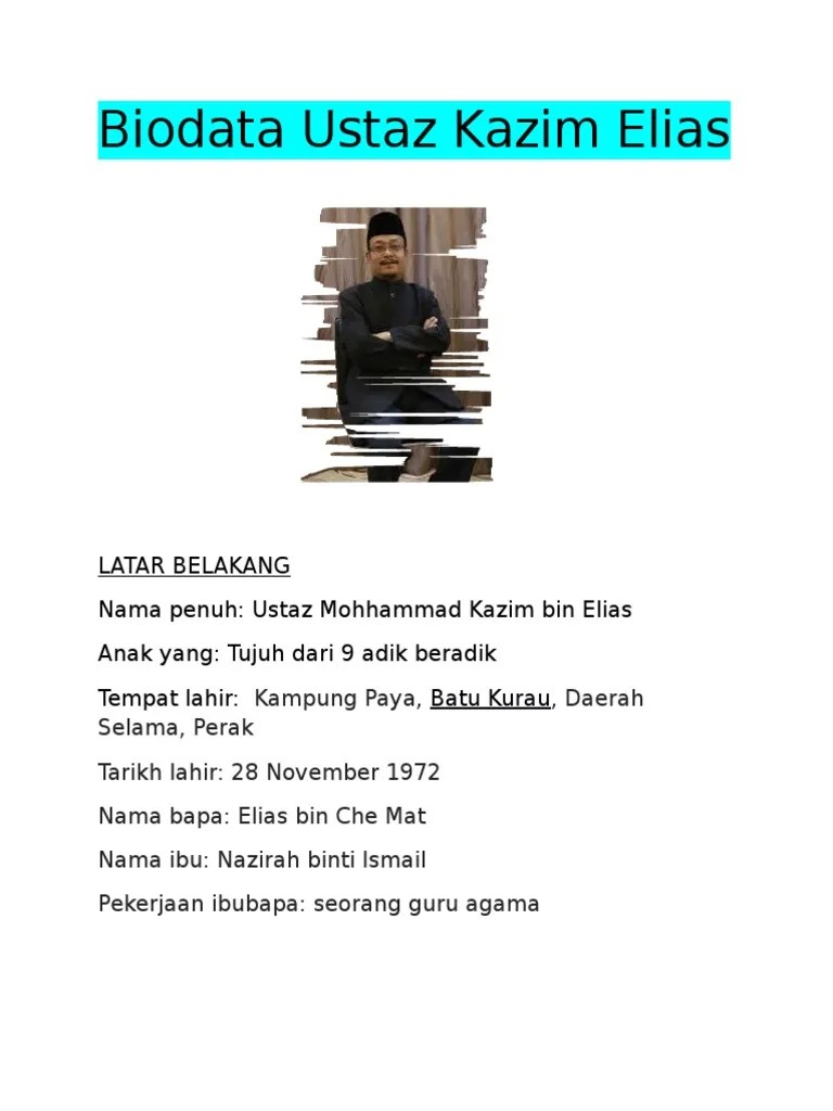 Datuk ustaz mohammad kazim bin elias dilahirkan di kampung paya, isteri ustaz kazim elias. Dapat anak sedara baru dato ustaz mohd kazim elias facebook.